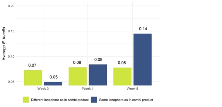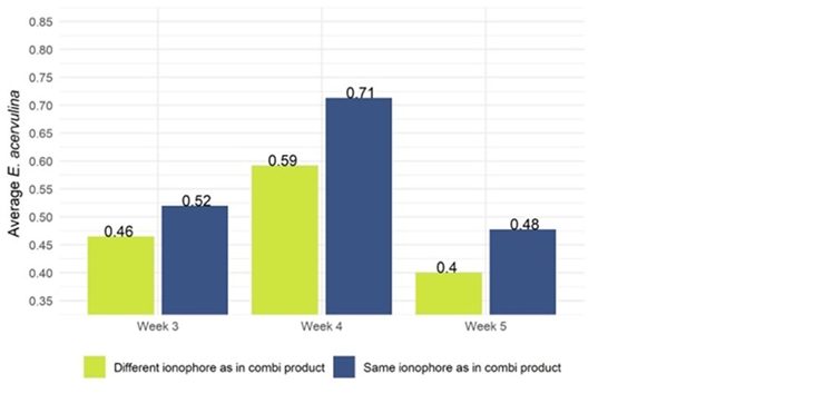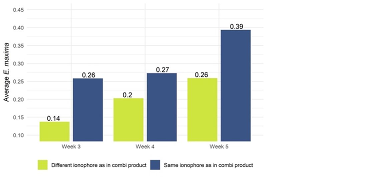 복합제에 포함된 것과는 다른 아이노포어로 전환한 셔틀 프로그램 (eg. narasin + nicarbazin → salinomycin 또는 monensin)은 모든 주요 Eimeria 종에 대해